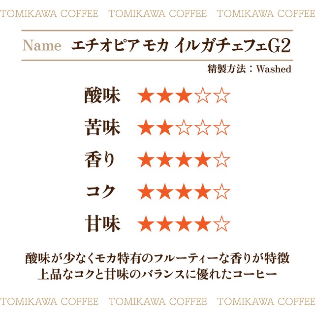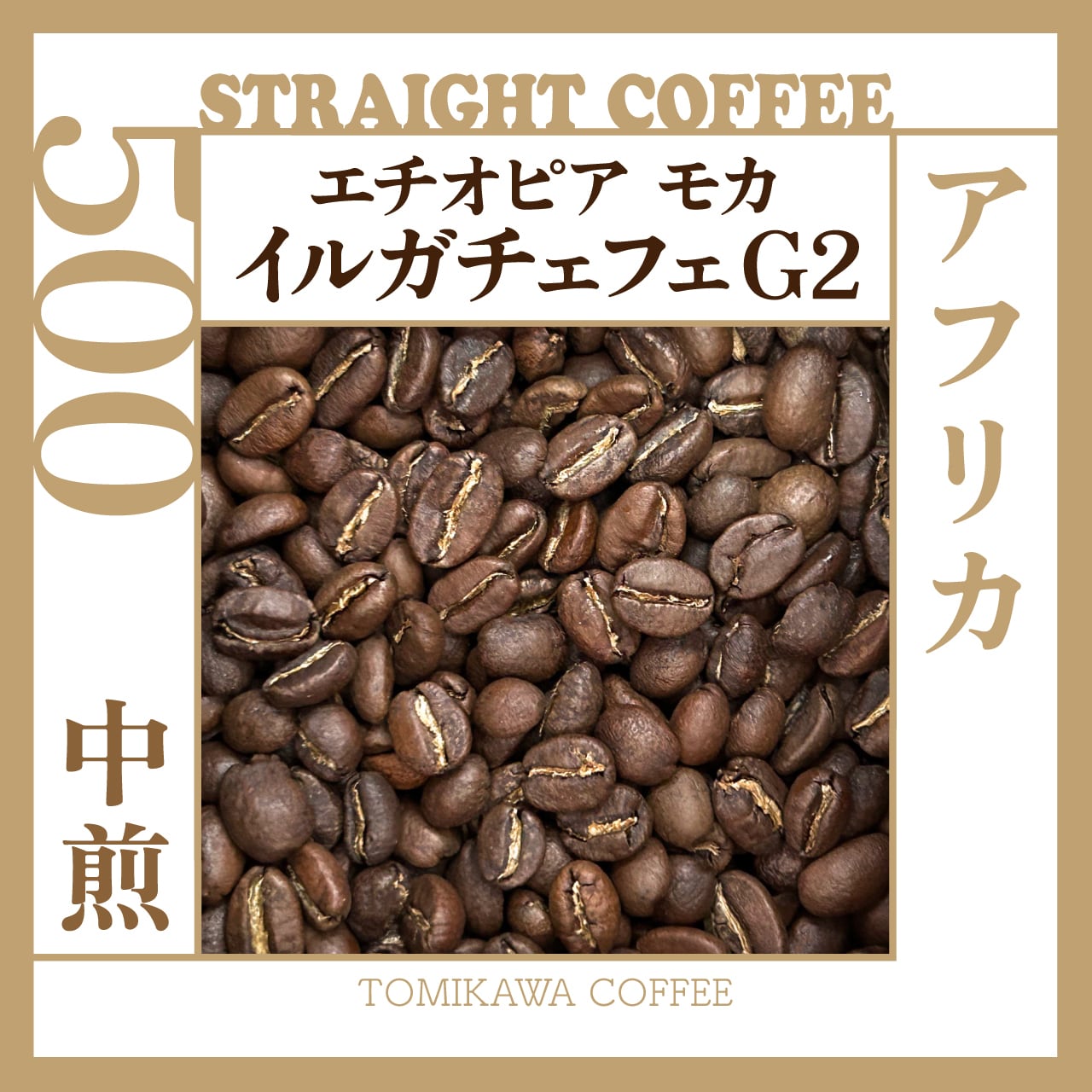 エチオピアモカ イルガチェフ G2は、酸味が少なくモカ特有のフルーティーな香りが特徴のコーヒーです。上品なコクと甘味のバランスがとれた優しい味わい。エチオピアのイルガチェフ地区で栽培された高品質なコーヒー豆を厳選して使用しています。