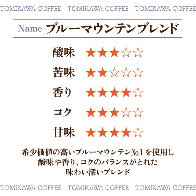 ブルーマウンテンNO1とジャマイカに近い国のコーヒー豆をブレンドしました。 香りコクがありまろやかで口当たりがよいコーヒーです。